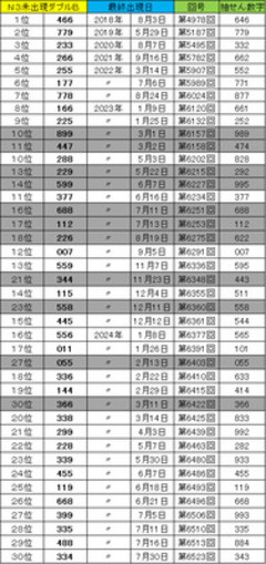 ![]() [「かくれんボックスダブル#15」] 2026年2月24日 ![]() ※グレーの網掛けは出現した数字 〜〜〜〜〜〜〜〜〜〜〜〜〜〜〜〜〜〜〜〜〜〜〜〜 今回はしばらく更新していなかった、N3長期未出現ダブルボックス数字(通称かくれんボックスダブル)をお知らせします。 「かくれんボックスダブル」とは「かくれて見つからないダブルボックス数字」のことです。 上記の表は、コラムバックナンバー「かくれんボックスダブル#14」の2025年8月15日第6792回終了時点の表を更新したものです。 ※超速サイトコラムでは、表が見えにくいと思いますので、超的中法WEBサイトの私のコラムで見てくださいね。 2026年2月20日第6924回終了時点で、かくれんボックスワースト10位だった「899」11位「447」13位「229」14位「599」16位「688」17位「112」など11点が出現しました。 現在のワースト1位は、2018年8月3日第4978回より1946回出現なしの「466」。 もう7年6か月以上出ていません。 2位は2019年5月29日第5187回より1737回出現なしの「779」。 3位は2020年8月7日第5495回より1429回出現なしの「233」。 4位は2020年9月16日第5782回より1142回出現なしの「266」となっております。 ミニのボックスで、現在ワースト1位は、第6694回より230回出現なしの「15」。 表から「15」を探して「115」。 2位は、第6718回より206回出現なしの「33」。 表から「33」を探して「233」「633」「833」「533」「433」。 3位は、第6776回より148回出現なしの「17」。 表から「17」を探して「717」が期待大。 N3ボックスペアワースト1位は、第6798回より126回出現なしの「33」。 表から「33」を探して「233」「336」「338」「335」「334」。 2位は、第6810回より114回出現なしの「77」で「779」「177」「778」「377」。 3位は、第6836回より88回出現なしの「17」で「177」が期待大。 また、一の位で「2」が、第6901回より23回出現なしなので、「332」「662」「552」「522」「882」「992」「822」が期待大。 まだ4年以上出ていないダブルボックス数字が、かなり残っていますので、軸にしたい数字があれば、3回に1回のペースでダブルが出現しておりますので、3〜4回シングルが続いた後に、ダブル数字を狙ってみてください。 ♪すうじがね 風車でクルクル かくれんぼ どんなにじょうずに かくれても いつかは必ず 見つかるよ だんだん だれが めっかった♪ ――つづく。 〜〜〜〜〜〜〜〜〜〜〜〜〜〜〜〜〜〜〜〜〜〜〜〜〜 今回のおすすめN3は、第6924回終了現在、第6836回より 88回出現なしのボックスペア[17]狙いで 10点。 [170] [171] [172] [173] [174] [175] [176] [177] [178] [179] 超速ロト・ナンバーズTOPへ(C)イマジカインフォス