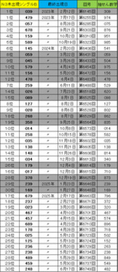 ![]() [「かくれんボックスシングル、#19」] 2026年3月31日 ![]() 〜〜〜〜〜〜〜〜〜〜〜〜〜〜〜〜〜〜〜〜〜〜〜〜〜 「かくれんボックス」とは、読んで字のごとく「かくれて見つからないボックス数字」のことだ。 上記の表は、3月27日(金)第6949回終了現在の長期未出現ナンバーズ3シングルボックス数字。 コラムバックナンバー「かくれんボックスシングル#18」昨年の11月14日第6857回時点の表から出現した数字をグレーで網かけして、新たにボックス数字を追加して更新しました。 ※超速サイトコラムでは、表が見にくいと思いますので、超的中法WEBサイトのわたしのコラムで見てくださいね。 バックナンバーを確認していただければわかると思いますが、4ヵ月更新しないあいだに、たくさん見つかりました。 1位「357」 8位「059」 9位「045」 10位「579」 11位「156」 12位「478」 14位「026」 15位「089」 18位「268」 19位「358」 26位「179」 28位「378」 29位「239」 30位「169」と14個出現。 現在のワースト1位は「479」で2023年7月17日より2年8ヵ月以上出現していません。 回号で言えば第6949回終了現在、第6255回「974」より694回出現なし。 2位「057」は、8月28日第6285回「075」より664回出現なし。 3位「678」は、9月21日第6303回「876」より646回出現なし。 4位「159」5位「589」6位「145」も2年以上出現なし。 第6949回終了現在、一の位「6」が、第6915回より34回出ていないので、 表から「6」を探して一の位にあてはめ「786」「796」「476」「896」「236」が期待大。 シングルボックスペア数字ワースト1位「56」は、第6877回より72回出ていないのですが、「56」ペアがありませんでした。 ワースト2位「02」は、第6892回より57回出現なし。 「02」ペアを探して「028」「023」「025」が期待大。 3位「59」は、第6900回より49回出ていないので、 「159」「589」「259」「459」が期待大。 シングルストレートペア数字ワースト1位は、第6454回より495回出現なしの「9※5」なので、 「915」「985」「925」「945」が期待大。 2位は、第6499回より450回出現なしの「※26」なので、「326」が期待大。 3位は、第6576回より373回出現なしの「※51」なので、「951」「251」が期待大。 大穴数字が好きな人は、狙ってみてはいかがでしょうか? また、軸にしたい数字や出そうかなと思う数字があれば、かくれんボックス数字から選んでみてはいかが? ♪かくれんぼなんかしてないで もう出てあげるって 早く言って もう当てたい その言葉が宙に舞う〜♪ 〜〜〜〜〜〜〜〜〜〜〜〜〜〜〜〜〜〜〜〜〜〜〜〜〜 今回のおすすめN3は、第6949回終了現在、第6916回より 33回出現なしの3けたプラス[14]狙いで 10点。 [086] [176] [338] [365] [392] [446] [626] [770] [851] [905] 超速ロト・ナンバーズTOPへ(C)イマジカインフォス
