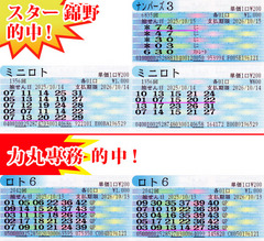 ![]() [力丸専務、N3GS目前連発っ‼] 2025年10月18日 ![]() 13日(月祝)、東京抽せんに戻って、まずはロト6で専務が5等2口をQPで軽やかにゲット! このサクッと感がさすがです! するとナンバーズ3では当せん数字「278」をなんと「279」グランドスラム狙いの専務! 抽せんライブを見ていて思わず叫びましたが、無常にも風車盤の一の位は「8」でした…。くぅー‼ 14日(火)は僕の出番! ミニロトで4等2口を自力でゲット! やっぱり僕はミニロトと相性いいかも♪ 対する専務は、ナンバーズ3で当せん数字「404」を「043」グランドスラム狙い、さらに本誌予想も「014」と昨日に続き惜しい結果に! 15日(水)は昨日に続き僕のステージ! なんとナンバーズ3で当せん数字「374」の「74」ミニをゲット! これ来月号の本誌予想を買っての当せんなんだけど、この日のいて座の占いが2位! 専務に「ナンバーズやってみれば?」と背中を押されたのもあって、買ってみたのが吉ってわけ! ありがとう占いと専務! その専務は、「304」グランドスラム狙いでまたまた惜しいひとつ違いに! ちなみに専務のしし座は占い1位でした♪ 16日(木)は、またまた専務が魅せます! ナンバーズ3で当せん数字「157」をなんと「156」グランドスラム狙い! もうどうなちゃってるんでしょうか!? さすがに「グランドスラムが遠い」と専務。さらにナンバーズ4でも当せん数字「4325」を「5023」「5523」で買ってた専務! これまた惜しすぎます‼ 17日(金)は、ナンバーズ3で当せん数字、まさかの「729」(専務の誕生日)。これを専務の買い目「790」グランドスラム狙いが、またもひとつ違い! 「今週はこんな週…」とボソッと専務。でも表情はにこやかでしたよー! これは来週に期待です‼ 今回はここまでで2人合わせて、779週連続当せん。オススメ数字は、ご長寿番組で知られる「くいしん坊!万才」が「50」年の歴史に幕を下ろします。最終回は「11」月「22」日。なにか数字にパワーがありますよ! いままでおいしい番組をありがとう♪ 超速ロト・ナンバーズTOPへ(C)イマジカインフォス