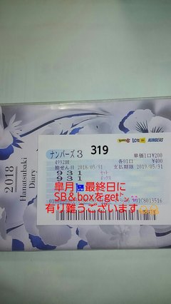 ◆皐月最終日にN3SB&boxをgetdしました(^^)v たかはん(20215798)/富山県/38歳/女性 ![]() ぉ今晩は(^^)/ 追っ掛けしてる数字が近付いたり離れたりして、かなりモドカシイ思いで一杯のこの頃です。後1ツが合わず〜というのは皆々様♪経験されていますよね(--;) 昨日継続数字では無かったのですが、たまたまdarling(^3^)/が汗かいた後の脚のにおいがあまりにも…だったので、思わず臭い:931の語呂合わせで購入した所、ビンゴしました(@_@)(^^) 日付並びで配当金が低めだったのが残念ですが、約3カ月半振り位のアタリチャンgetdに感謝です(^人^) 今日から水無月。沢山×Iアタリチャンgetdしていきましょうねp(^^)q 2018-06-01 19:45:37