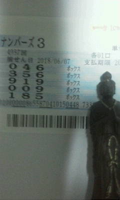 ◆やぁ〜っと、やぁ〜っとこさナンバーズBボックスに ![]() ミスター・K(20321199)/福岡県/57歳/男性 ![]() ![]() ナンバーズでの大当たりは約2ケ月ぶりなので、本当にうれしいです!! サイトの皆さん、神様仏様ご先祖様満月様般若様ありがとうございます!! 追伸…ちなみに今回の紙押さえになっていただいたのは月光菩薩様です!!何か後光が差しているような感じに見えませんか(笑)!! {オーラカモシレナイナ!}2018-06-07 20:07:56