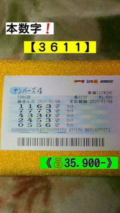 高額当選は6回目です!去年のナンバーズ4当選金額は【1.035,900円】で ロト6は約【400,000円】でした。本日ナンバーズ4QPセット(ボックス)で・・・【35.900円】当選しました!因みに本数字が【3611】で【1163】でした。逆からだったら【460.000円】だったので・・・残念悔しい!